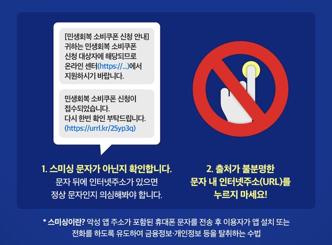 이에 따라 정부와 카드사, 지역화폐사는 소비쿠폰과 관련한 문자에 인터넷 주소(URL)뿐 아니라 유사 기능을 하는 배너나 앱푸시도 절대 사용하지 않을 방침이다.