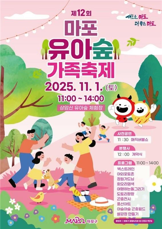 마포구(구청장 박강수)는 아이들과 가족이 함께 도심 속에서 자연을 즐길 수 있는 `제12회 유아숲 가족축제`를 오는 11월 1일(토) 상암근린공원 내 유아숲체험원에서 개최한다.