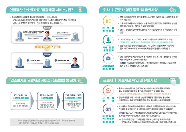국세청이 21일 연말정산 간소화자료를 회사가 직접 받아 처리하는 ‘간소화자료 일괄제공 서비스’ 신청을 오는 30일까지 접수한다고 밝히며, 근로자와 기업 모두의 연말정산 부담을 크게 줄일 수 있다고 안내했다.