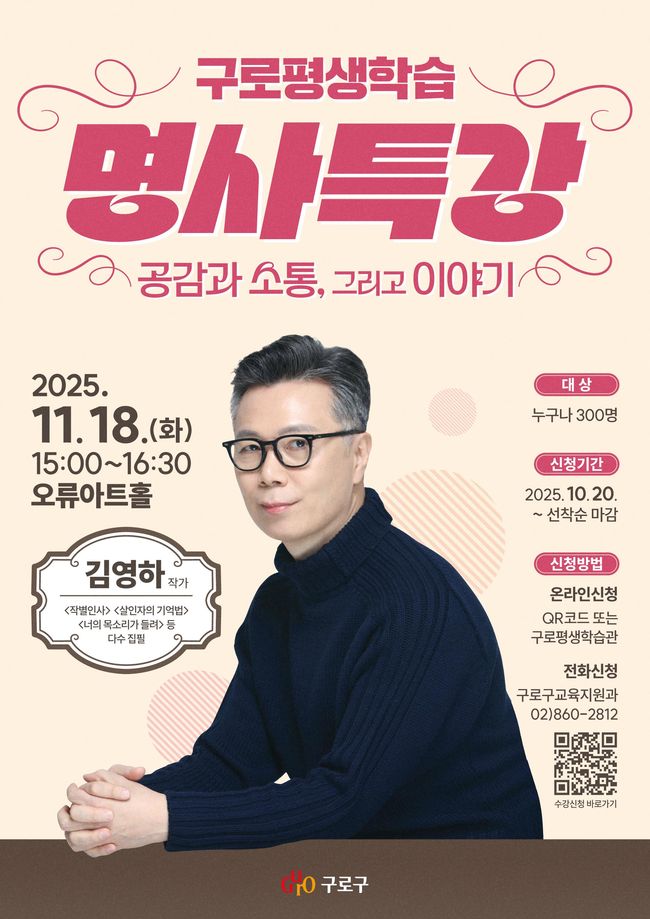 특강은 오후 3시부터 4시 30분까지 진행되며, 참가비는 무료다. 수강 신청은 10월 20일부터 선착순으로 접수할 수 있으며, 구로평생학습관 누리집 또는 큐알(QR)코드, 전화(02-860-2812)를 통해 가능하다. 모집 인원은 300명으로, 구로구민과 구로구 내 직장인이 대상이다.
