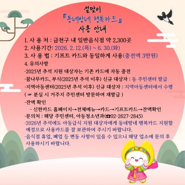 유성훈 금천구청장은 "동네방네 행복카드가 아이들이 가족과 함께 행복한 명절을 보내는 데 작은 보탬이 되길 바란다"라며, "앞으로도 금천의 아이들이 밝고 건강하게 성장할 수 있도록 따뜻한 지원을 계속 이어가겠다"라고 전했다.