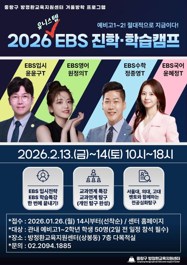 중랑구 방정환교육지원센터, 겨울방학 맞아 `2026 EBS 진학 · 학습캠프` 운영.중랑구 방정환교육지원센터는 겨울방학을 맞아 관내 예비 고등학교 1~2학년을 대상으로 ‘2026 EBS 진학·학습 캠프’를 진행한다고 11일 밝혔다. 캠프는 오는 2월 13일부터 14일까지 이틀간 오전 10시부터 오후 6시까지 중랑구 망우로 325에 위치한 방정환교육지원센터에서 열린다.